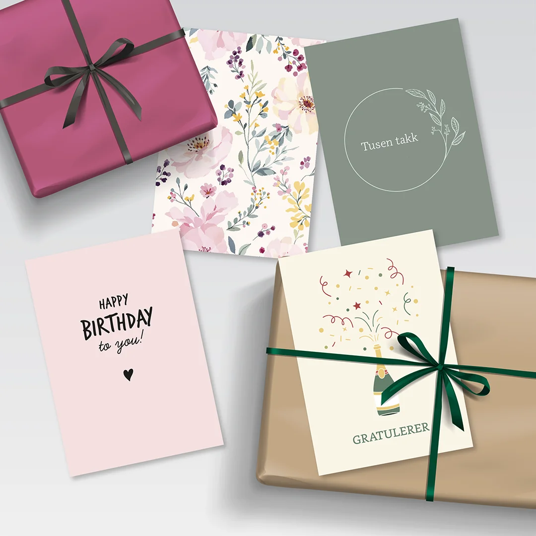 Kortene passer til bursdag, jubileum, gratulasjoner eller små hverdagslige oppmerksomheter.